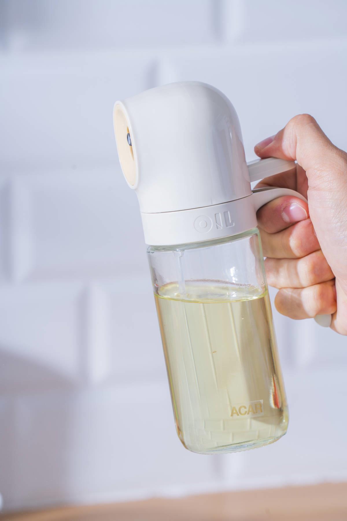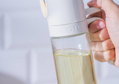 Bouteille d’huile et de vinaigre en verre pulvérisateur.